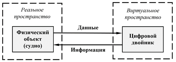 В целях настоящего исследования констатируем, что морское судно первично появляется в виртуальном пространстве в виде цифрового двойника прототипа, а уже на следующем этапе появляется физический объект, у которого после начала эксплуатации появляется свой DTI.