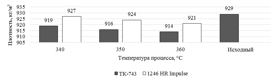 2. При повышении температуры наблюдается тенденция к понижению значений основных показателей качества, при чем при использовании катализатора ТK-743 наблюдается наибольший эффект: температура застывания снижается на 13 %, плотность практически не изменяется, кинематическая вязкость снижается на 28 %, коксуемость – 36 %. Таким образом, при заявленных режимах гидроочистки качество мазута не ухудшается и его можно использовать в качестве товарного мазута.