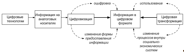 - цифровизация отражает техническую составляющую работы цифровых технологий и связана с оцифровкой информации;