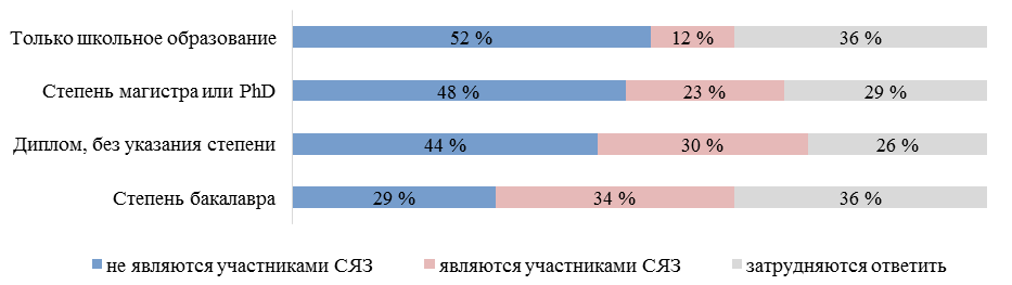 – образование: результаты опроса определили, что респонденты с дипломом бакалавра наиболее склонны к СЯЗ, что может свидетельствовать о том, что уровень образования влияет на уверенность в своих знаниях и желании делиться ими;