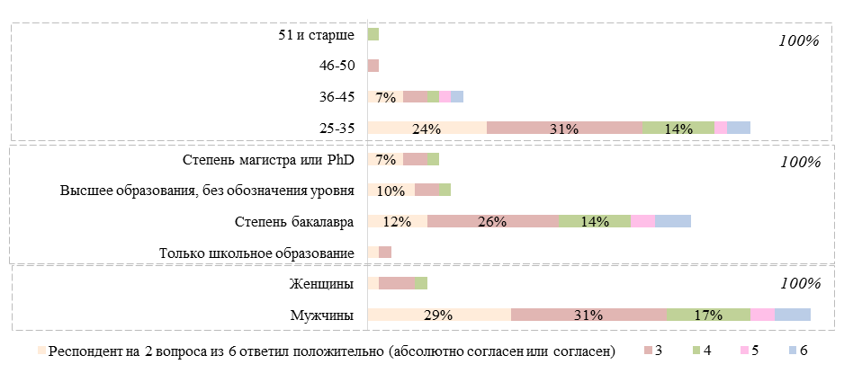 Итак, портрет респондента, склонного к СЯЗ, может быть представлен следующим образом: мужчина со степенью бакалавра в возрасте 25–35 лет (рис. 7), где 7 % (от ответов всех респондентов, которые ответили на 2 и более ответа положительно) ответили на 2 ответа положительно; 19 % – на 3; 10 % – на 4; 2 % – на 5; 5 % – на все 6 вопросов.