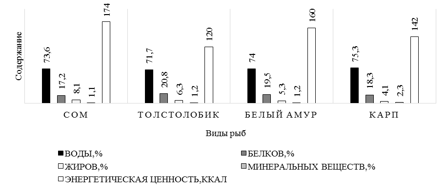 Проведен сравнительный анализ химического состава и энергетической ценности рыбного сырья – объектов исследования (рис. 1).