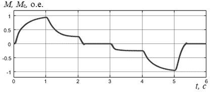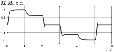 На рис. 5 представлены результаты имитационного моделирования работы гребного синхронного электропривода на вентиляторную нагрузку с косинусоидальным изменением коэффициента нагрузки при оголении гребного винта на 4-й с (wзад – задание скорости, о. е.; w – текущая скорость двигателя, о. е.).