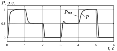 На рис. 6 представлены переходные процессы при пуске на полный ход, при переходе на средний ход, при реверсе и останове гребного двигателя при нормальных условиях нагрузки (Р – механическая мощность на валу двигателя, о. е.; Pзад – задание мощности, о. е.; М – электромагнитный момент двигателя, о. е.; Мс – момент нагрузки, о. е.).