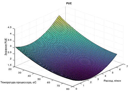 Рис. 7. Оптимум PUE от температуры процессора и расхода теплоносителя
