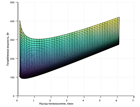 Рис. 8. Зависимость потребляемой мощности системы охлаждения: