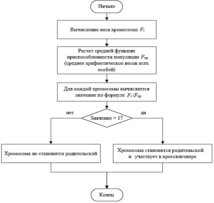 Сначала вычисляется вес каждой хромосомы Fi, затем находят среднюю функцию приспособленности популяции Fср как среднее арифметическое значений весов всех особей, далее для каждой хромосомы вычисляется значение отношения