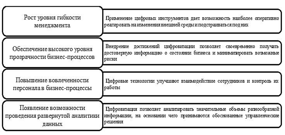 Необходимо также отметить, что в современных условиях цифровой менеджмент выступает не только в качестве современной системы управления и совокупности цифровых инструментов, но и может быть рассмотрен с точки зрения полноценной концепции, направленной на осуществление структурной цифровой трансформации предприятий, в том числе в сфере управления информационными данными. Кроме того, переход к системе управления на основе цифровых технологий оказывает существенное влияние на продуктивность корпоративных коммуникаций внутри предприятий, предоставляя возможности для координации деятельности сотрудников и автоматизации наиболее рутинных задач и бизнес-процессов [5].