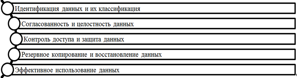 Среди существенных проблемных зон управления информацией в современной структуре цифрового управления необходимо выделить отсутствие системы архитектуры информационных сведений в рамках предприятия, неэффективную аналитику данных, а также необоснованное внедрение цифровых инструментов, которые на самом деле не являются необходимыми или ценными для бизнеса. Процесс управления основан на ряде принципов, соблюдение которых обеспечивает высокий уровень эффективности взаимодействия с большими массивами информации (рис. 2).
