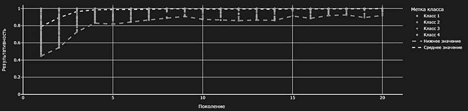 На каждом поколении формируется множество особей (наборов гиперпараметров) x, которые мутируют с определенным отклонением N. Область допустимых значений отклонения рассчитывается для каждой особи на основе функции аффинности aff, которая определяет качество модели по метрикам F-меры и roc-auc. Добавленный весовой коэффициент влияет на дисперсию мутации: чем выше вес гиперпараметра, тем меньше он мутирует. Результаты расчета комплексного показателя результативности с учетом весовых коэффициентов значимости представлены на рис. 4.