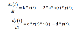 [Lorenz]=@(t, x) [k*x(1) – 2c*x(1)*x(2); c*x(1)* – d*x(2)];