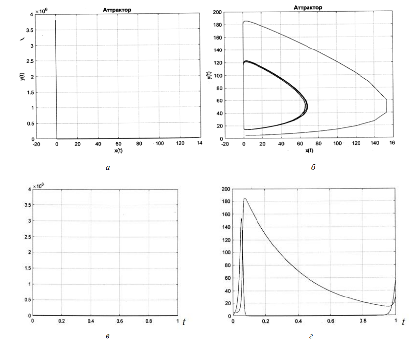 а, b – attractors; в, г – time characteristics (by ordinate axis placed variable x(t), y(t) in relative units)