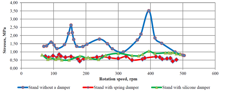 As can be seen from Fig. 5, both dampers effectively reduce the level of both resonant and non-resonant stresses and equalize the voltage dependence on the rotation frequency. At the same time, in the range of rotation speeds up to 250 min–1, the SD is more effective, with a further increase in rotation speed, the PD prototype is more effective. This, in particular, may confirm the effectiveness of the PD installation on modern marine high-speed engines.