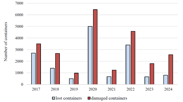 According to the World Shipping Council [7], in 2024, an estimated 576 containers were lost at sea out of approximately 250 million transported. While this represents an increase from 221 containers lost at sea in 2023, it remains well below the 10-year average of 1 274. In 2022, 661 containers were lost at sea. This represents less than one thousandth of 1% (0.00048%) of the roughly 250 million packed and empty containers currently shipped each year, with cargo transported valued at more than $7 trillion. Reviewing the results the WSC estimates that there was on average a total of 1 566 containers lost at sea each year. The average losses for the last three years were 2 301 containers per year. Statistics on the number of damaged and lost containers for the period 2016-2024 are shown in the Figure.