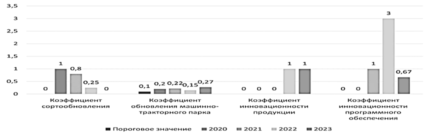 «Доля высокотехнологичной и наукоемкой продукции во внутреннем валовом продукте свидетельствует об интеграции научных подходов и методов, так данный показатель значительно отстает от среднероссийского уровня на протяжении всего оцениваемого периода. Несмотря на вышеприведенные данные по показателям, доля организаций, осуществляющих технологические инновации удовлетворяют пороговому значению и находятся в пределах экономической безопасности» [7, c. 158]. Одной из таких организаций и является ООО «АПК Астраханский», поэтому проанализируем инновационную составляющую его экономической безопасности и отразим динамику изменения ее показателей в сопоставлении с их пороговыми значениями на рис. 1. Все показатели инновационной безопасности, представленные на рис. 1, за исключением коэффициента сортообновления, на момент 2023 г. находятся в пределах своих пороговых значений.