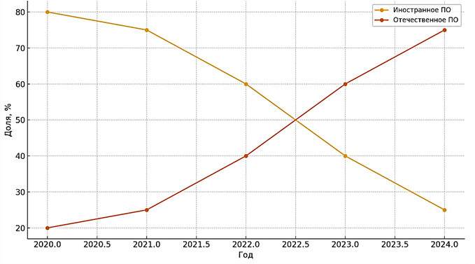 Структура используемого ПО также меняется: доля иностранных решений сокращается в пользу российских, что поддерживается государственной политикой.