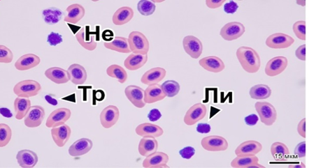 Не – нейтрофил; Тр – тромбоцит; Ли – лимфоцит. Шкала масштаба 15 мкм
