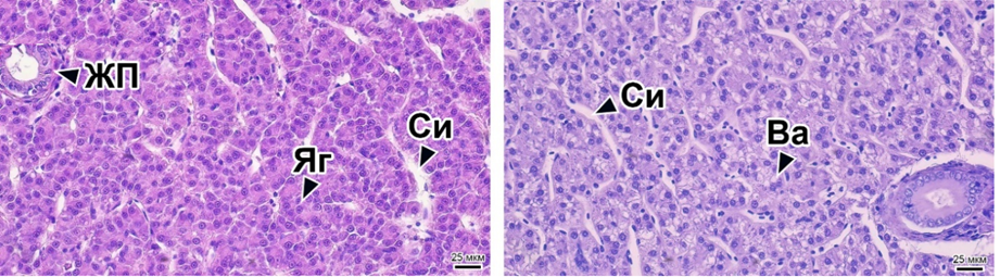 ЖП – bile duct; Яг – hepatocyte nucleus; Си – sinusoidal capillary;