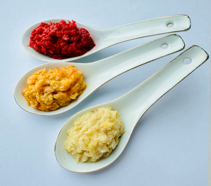 Состав блюд отличается добавлением в первый образец белокочанной капусты, во второй – свеклы, в третий – томатов. На рис. 1 представлен внешний вид полученных образцов риетов и вариант подачи как холодной закуски.