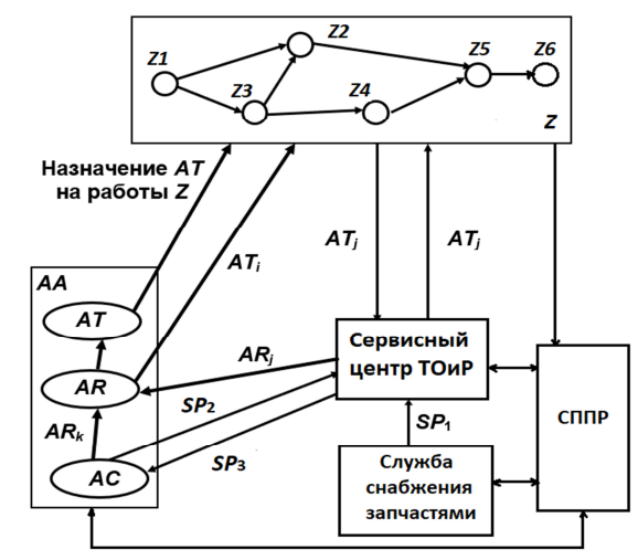 Календарно-сетевой график работ Z определяет последовательность и длительности выполняемых АА операций Z1–Z6. Управление процессами обеспечивается с помощью системы поддержки принятия решений (СППР). Во время эксплуатации проводится мониторинг и диагностика технических состояний автомобилей из набора AT. В случае обнаружения у автомобиля ATj неисправности либо при необходимости проведения регламентного или прогнозного технического обслуживания ATj выводится из эксплуатации и направляется в сервисный центр технического обслуживания и ремонта (СЦ ТОиР). При наличии запасных частей для своевременного технического обслуживания автомобиль ATj после ТО возвращается в эксплуатацию для выполнения работ Z. Если же планируемая длительность работ по ТО достаточно большая и остановка выполнения операций Z недопустима, то один из резервных автомобилей ARi получает статус активного (ARi → ATi) и переводится в эксплуатацию. При этом обслуживаемый автомобиль ATj по завершении ТОиР переводится в резервное состояние (ATj → ARj). В статье [13] разработана методика виртуальных испытаний системы АА, основанная на оценке множества сценариев эксплуатации с помощью многофакторного анализа. Однако использованный метод DEA не позволяет учесть влияние вероятностных факторов, связанных с процессами эксплуатации в различных условиях. Предлагается дополнить такое исследование процедурой имитационного моделирования различных сценариев на базе стохастических временных раскрашенных сетей Петри, что обеспечивает задание случайных законов для различных параметров. Множество сценариев анализируется при проведении статистических экспериментов на имитационных моделях с заданием исходных данных как по внешним условиям эксплуатации, так и по техническим и производственным показателям АА.