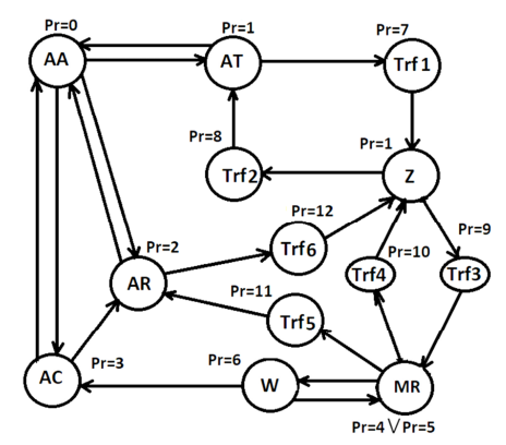 На рис. 1 представлен пример взаимодействия основных блоков, входящих в общую структуру производственно-логистической системы, а на рис. 2 приведен граф состояний системы АА в виде конечного автомата, обозначения на графе раскрыты в табл. 1.