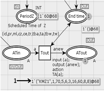 На рис. 6 приведен фрагмент сети Петри с терминальным маркером в позиции ATout после завершения работ Z.