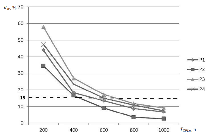 Для примера на рис. 7 показана зависимость коэффициента KW от параметров, заданных в табл. 5. Допустимый уровень коэффициента KW принят равным 15 % и отмечен на рис. 7 пунктирной линией. Анализ показывает, что наименьшее отступление от планового срока обеспечивает набор параметров Р2 (см. табл. 5), начиная с работ со сроком больше 430 ч. По результатам эксперимента на модели получен достаточно большой объем данных, который позволяет оценить эффективность различных сценариев эксплуатации и обслуживания комплекса АА.