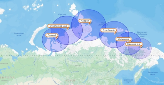 Рис. 3. Контрольно-корректирующие станции на Северном морском пути с радиусом покрытия 600 км [6]