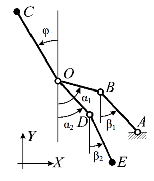 В работах [28, 29] предложен метод моделирования походки человека с помощью плоской пятизвенной модели (антропоморфного механизма), показанной на рис. 1: положение механизма характеризуется пятью координатами: φ, α1, α2, β1, β2, которые обозначают наклоны корпуса (OC), бедер (OB и OD) и голеней (BA и DE) относительно вертикальной оси соответственно.
