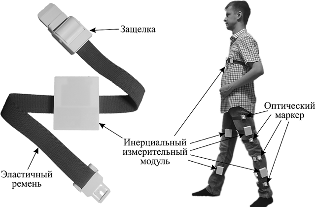 В данной работе используется 5 инерциальных измерительных модулей, размещенных, как показано на рис. 3, б, на бедрах, голенях и корпусе. На рис. 3, б также показано расположение светящихся маркеров на левой ноге, используемых при валидации данных, получаемых с модулей. При включении модуля осуществляется калибровка, во время которой устройство должно располагаться неподвижно и вертикально (ось Z должна быть направлена вверх, в противном случае измерения будут выполнены некорректно). Результаты измерений отправляются по беспроводному каналу с максимальной периодичностью 100 раз в секунду.