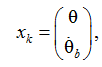 где x̂k–1|k–1 – оценка состояния системы в прошлый момент времени; F – матрица (модель) перехода между состояниями; B – матрица применения управляющего воздействия uk. Для текущей задачи матрица xk задается в следующем виде: