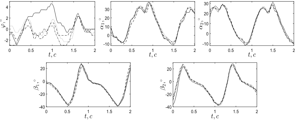 Рис. 5. Динамика движений корпуса (φ), бедер (α1 и α2) и голеней (β1 и β2),