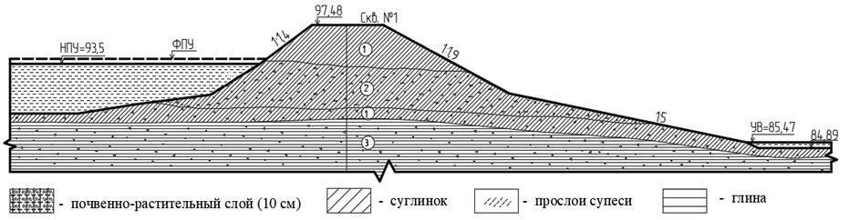 Рис. 4. Разрез по грунтовой плотине согласно результатам проведенных изысканий
