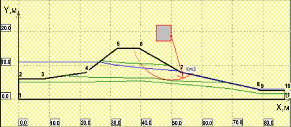 Рис. 8. Результат устойчивости откоса: 1–3 (см. рис. 4)