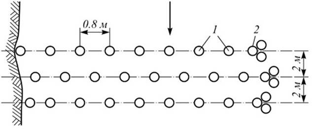 Пример сквозной полузапруды представлен на рис. 2. Полузапруда выполнена из свай, расположенных в шахматном порядке, забитых в три ряда, расстояние между которыми составляет 2 м, расстояние между сваями принято 0,8 м.